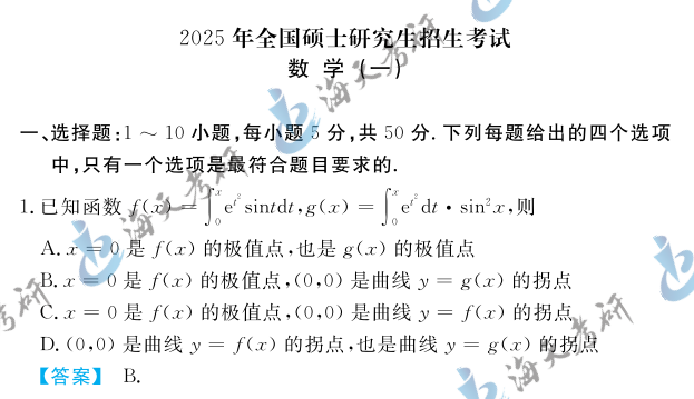 以上就是海天考研网为各位考生整理的2025考研数学(一)真题—选择题,仅限参考。持续为考研学子更新其他考研科目考研真题及答案解析,各位考生可以根据自身需要关注收藏,及时查看完整版2025考研真题及答案解析。